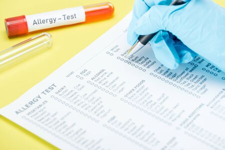 cropped view of woman in latex glove filling in allergy test form near test tubes with allergy test lettering isolated on yellow