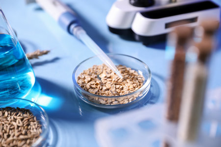 cereals in petri dish for analysis in laboratory with microscope wooden background no one