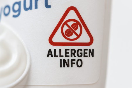 Close up of allergen warning label on yogurt package with red triangle and allergen symbol. concept of food safety, allergy awareness, ingredient information..