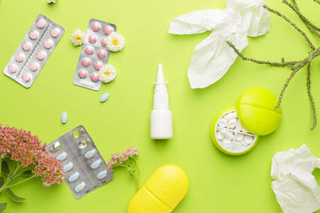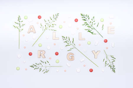 Allergy, Allergens, Seasonal allergies. Minimal Grass Allergy flat lay concept. Allergy madication pills isolated on white background.