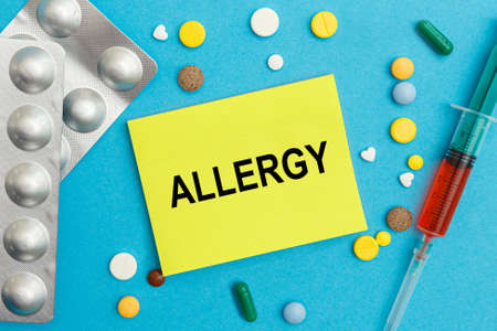 Card with text ALLERGY, pills and syringe. Medical concept.