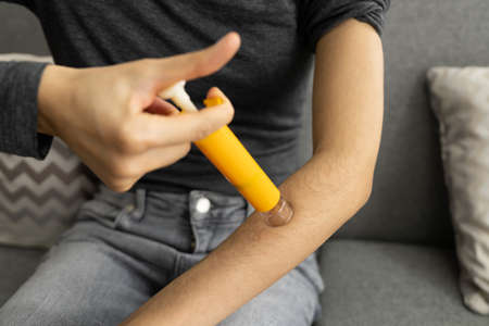 Mosquito repellent. Close-up of an insect repellant spray. Means for repulsion of blood-sucking parasites. concept photo