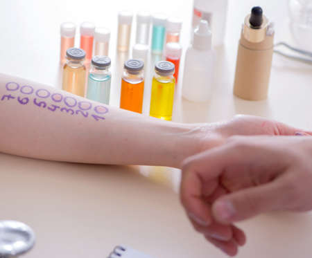 An allergist doctor in the laboratory conducts a prik allergy test. Skin test for household, food, epidermal allergic reactions