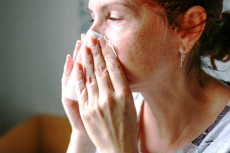 sick woman struggling with runny nose due to flu or allergies.