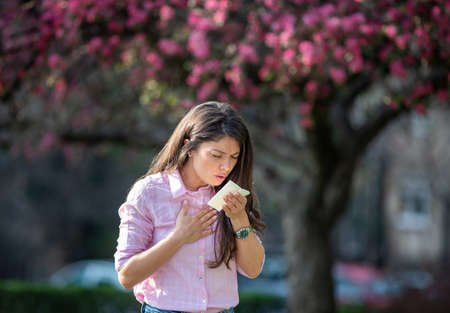 Afraid young woman sneezing in napkin in front of blooming tree. Spring allergy attack concept