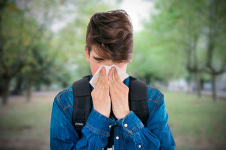 Boy with polen allergy is sneezing in the park