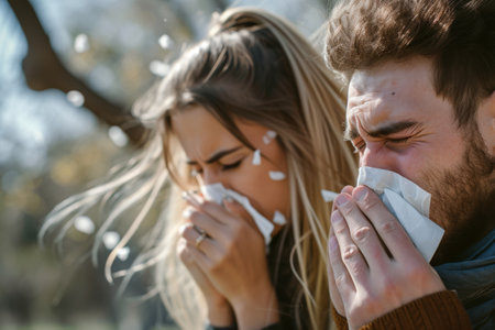 Person sneezing amidst pollen in sunlight