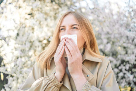 Portrait of beautiful young allergic woman is suffering from pollen allergy or cold on natural flower flowering tree background at spring or sunny summer day sneezes, blowing her runny nose rubs eyes