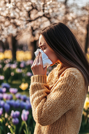 Woman experiencing allergy symptoms in a vibrant flower garden during springtime