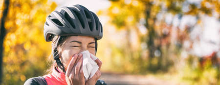 Cough in tissue covering nose and mouth when coughing outside as COVID-19 hygiene guidelines for Coronavirus spread prevention. Biking cyclist girl sneezing in paper outside. Panoramic banner.