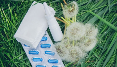 Allergy. Allergens, antihistamin pills, seasonal allergies. Minimal flat lay grass pollen allergy concept.