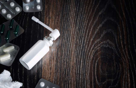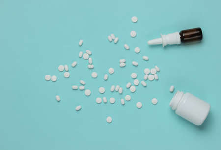 Pills and nasal spray, medicine from virus infections. White tubes of medicine products without a label for advertisement or blogger advice.