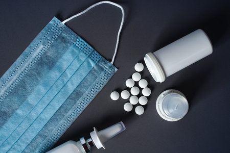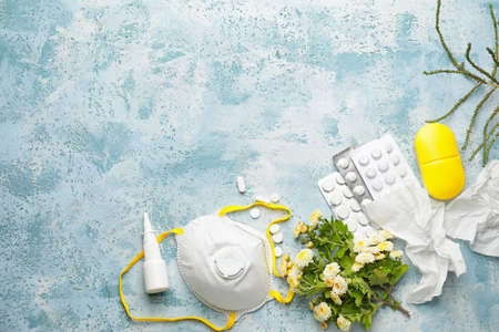 seasonal allergies. spring bloom allergy. Medical mask flower and pills. Flat lay on beige background. A man holding nasal spray