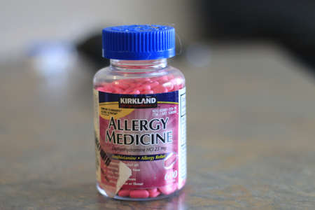 London Canada, april 14 2020: editorial illustrative photo of Costco Kirkland allergy pills. April is beginning of allergy season.