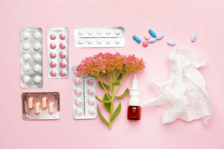 Allergy. Allergens, antihistamine pills, seasonal allergies. Minimal flat lay allergy concept.
