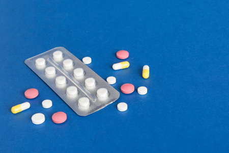 A set of tablets pack and pills in blisters on a blue background. Medical concept. White, yellow, pink tablets of various shapes. Treatment, self-care.