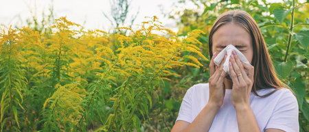 Young man sneezes because of an allergy to pollen. BANNER long format