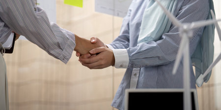Partnership and Focus on Sustainability. Two professionals engaging in a handshake, committing to renewable energy projects.