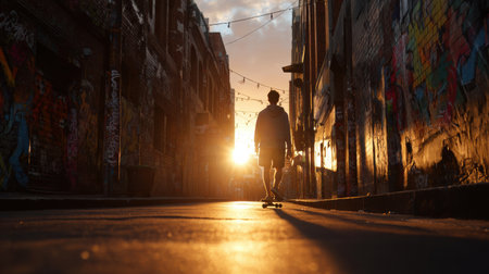 A young person skates down a narrow alley adorned with colorful street art as a golden sunset casts a warm glow, creating a vibrant atmosphere.