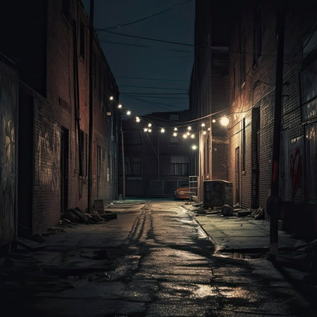 Exploring the eerie and mysterious urban alleyway at dusk with dim lighting, abandoned building, graffiti, and string lights