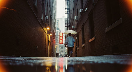 Rainy Alleyway With Person Holding Umbrella and Neon Bar Sign
