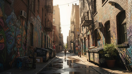 Vibrant Urban Graffiti Alley A dynamic street scene featuring bold, colorful graffiti adorning brick walls in a narrow urban alley