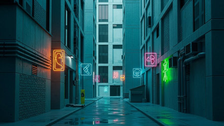 A captivating image of a vibrant urban alleyway illuminated by colorful neon lights at night, creating a unique and atmospheric urban scene.
