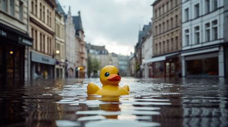An AI generated illustration of a yellow rubber duck on the wet ground of a street flooded with water