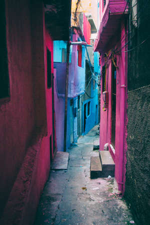 An alley with houses in Heliopolis, the biggest favela in San Paulo, Brazil, colored in blue, pink, purple and grey.
