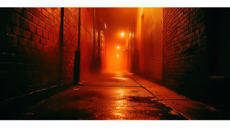 This captivating image captures a foggy alleyway at night, where glowing streetlights illuminate the wet pavement, creating a mysterious and eerie atmosphere.