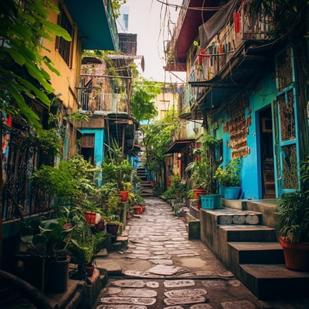 An AI generated illustration of a narrow alley street between buildings on a sunny day