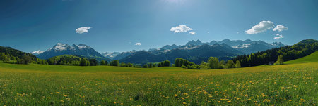 Experience the stunning Swiss landscape filled with blooming flowers and majestic mountains under a clear blue sky in springtime.
