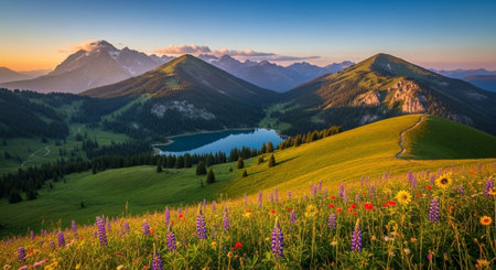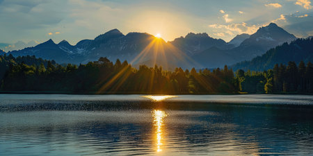 Mountains, lake, forest meet dawn's embrace. Tranquil scenery bathed in morning light
