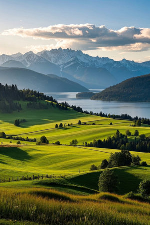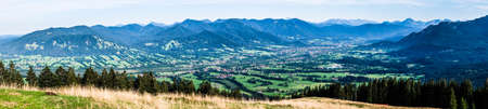 Scenic summer landscape with Alps mountains, lake and green field or meadow and forest in Bavaria, Germany, Central Europe