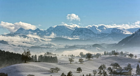 Mountain landscape with fog on the top of the mountain, Switzerland