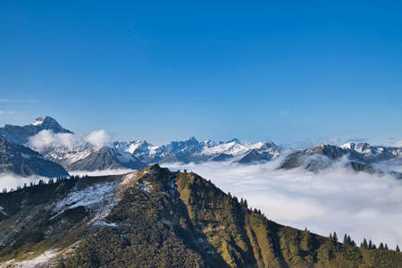 Panoramic view from Nebelhorn in Oberstdorf Allgäu Bavaria Germany - Beautiful Alps with lush green meadow and blue sky - Mountains landscape background banner panorama