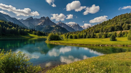 Idyllic alpine landscape with lake and mountains reflected in water