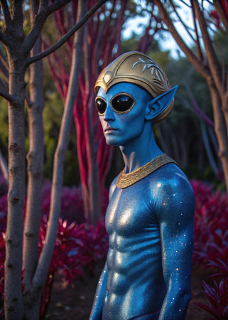 An Arcturian alien stands in a garden of strange red trees within his homeworld. AI Generated.