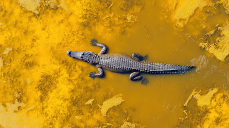 This image showcases a crocodile gracefully swimming in murky yellow water, highlighting its powerful presence in a natural habitat. The contrast of colors emphasizes the beauty and richness of the ecosystem.
