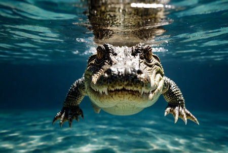 A stunning view of a crocodile gliding through clear water, illuminated by the sunlight above. The image captures the creature's intricate skin texture and natural grace, highlighting the peaceful coexistence within its habitat.