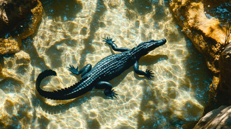 A stunning crocodile glides through serene waters, showcasing its majestic form amidst a rocky landscape and reflecting sunlight, embodying nature's beauty.