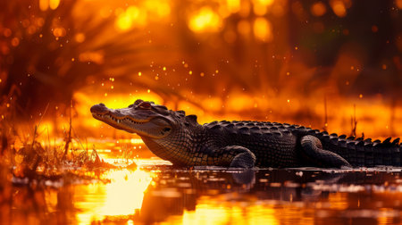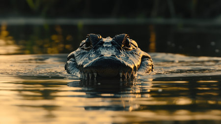 A captivating close-up of an alligator emerging from the water at sunrise, showcasing its powerful jaws and reflective eyes in a serene natural setting.
