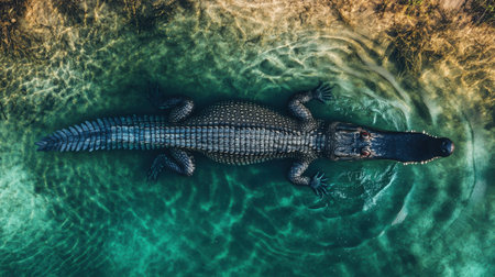 A stunning aerial shot capturing a crocodile gliding through clear waters, showcasing its intricate scales and powerful presence in its natural habitat.