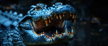 Crocodile with open mouth, dark background, fierce and menacing