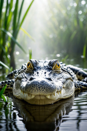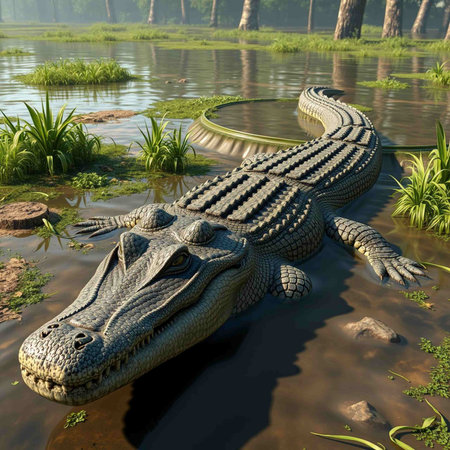Endangered crocodile hides in wetland, danger in its teeth generated by artificial intelligence