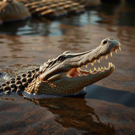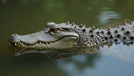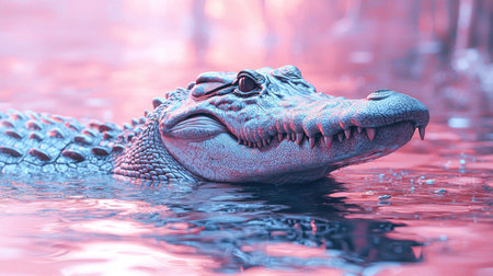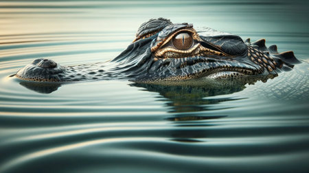 An AI-generated illustration of a crocodile's head emerging from tranquil waters