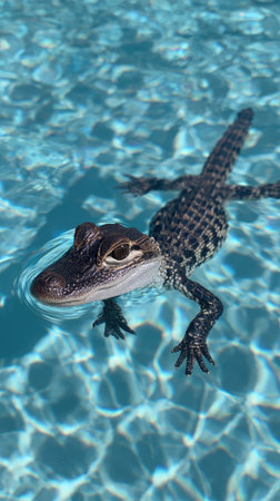 An alligator floats in clear blue water, its dark scales contrasting with the bright environment. The composition focuses on the reptile, highlighting its head and body. This image, with its vibrant colors and engaging subject, may be suitable for a variety of editorial or commercial purposes.