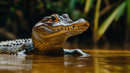 A captivating close-up of a crocodile swimming in the tranquil Amazon River.