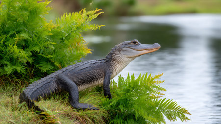 Alligator standing on grassy riverbank among ferns, observing its wetland habitat
