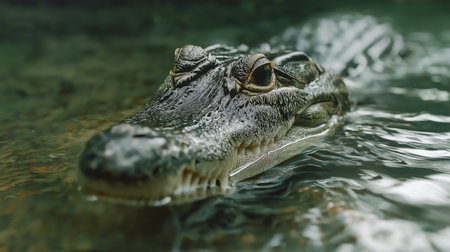 the crocodile's face emerges from the water, showcasing the distinct style of raphael lacoste. with a dark yellow and bronze color palette, this 32k uhd photograph by caras ionut captures the intricate details of the reptile. employing focus stacking techniques, the image takes on a voyeuristic approach reminiscent of peter coulson's work. ai generated